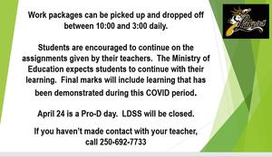 Work packages can be picked up and dropped off between 10:00 and 3:00 daily. Students are encouraged to continue on the assignments given by their teachers. The Ministry of Education expects students to continue with their learning. Final marks will include learning that has been demonstrated during this COVID period. April 24th is a Pro-D Day, LDSS will be closed. If you haven't made contact with your teacher, call 250-692-7733.